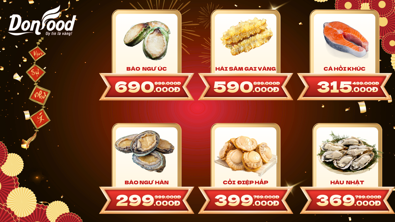 • Giá trị: Cơ hội dùng thử các món Hải sản cao cấp mới nhất của DonFood (ví dụ: một phần Cá Hồi phi lê cao cấp, cồi điệp Nhật hoặc các sản phẩm chế biến tiện lợi).