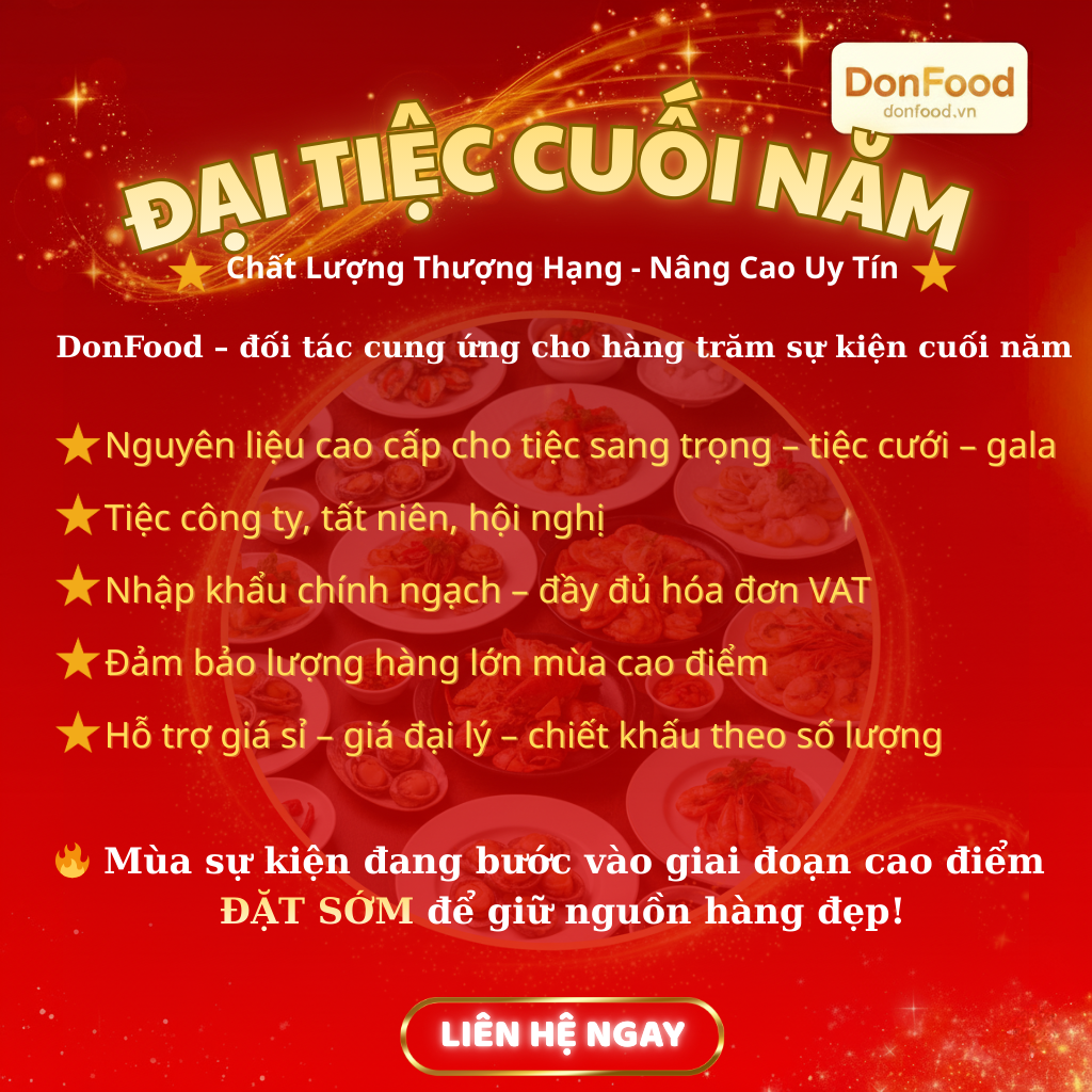 Cuối năm là cao điểm, nhu cầu tăng mạnh. Để đảm bảo chắc chắn có nguồn nguyên liệu đẹp – chuẩn – đủ số lượng, Quý đối tác vui lòng liên hệ DonFood sớm để được tư vấn menu – báo giá sỉ – kế hoạch cung ứng phù hợp.