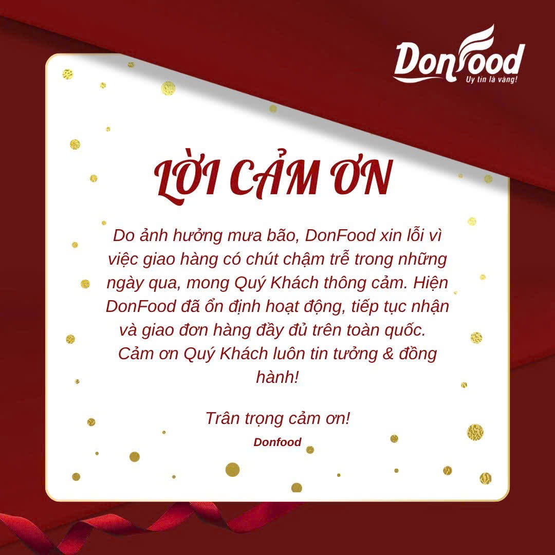 Trong những ngày vừa qua, do ảnh hưởng của tình hình mưa bão kéo dài, việc giao hàng của #DonFood có xảy ra sự chậm trễ ngoài mong muốn. Chúng tôi xin gửi lời xin lỗi chân thành vì đã làm ảnh hưởng đến trải nghiệm mua sắm và sử dụng sản phẩm của Quý Khách.
