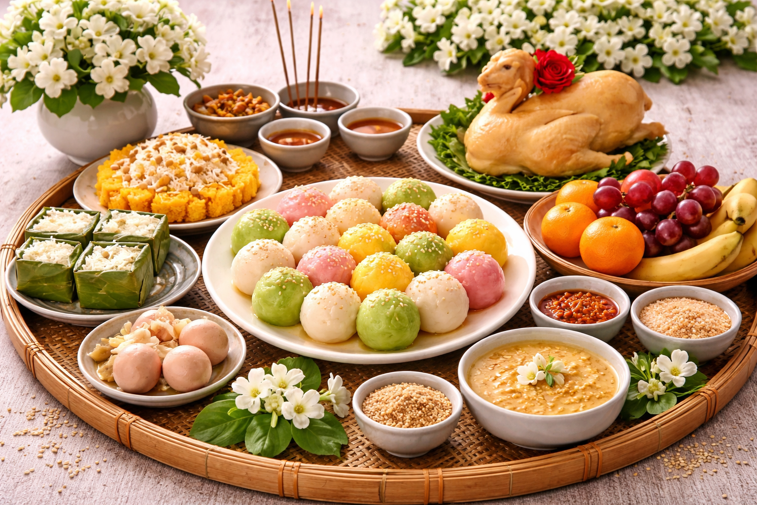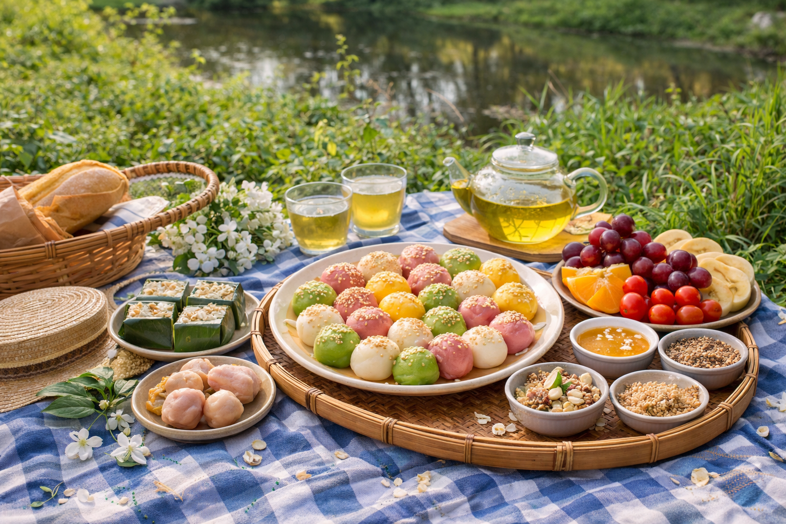 Một giỏ đồ ăn gồm bánh trôi, trái cây, hạt dinh dưỡng và trà sẽ mang lại trải nghiệm vừa truyền thống vừa hiện đại.